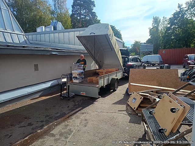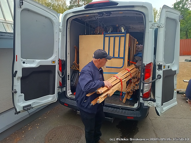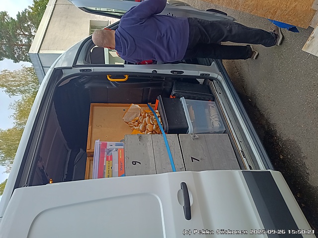 IMG_20250928_180128450.jpg Kello 18:01 kaikki oli pakattuna ja Oulun moduulit pakettiautossa. Paikalla oli vielä jokunen jalkanippu, ja etelän moduulit olivat kuljetusta odottamassa.