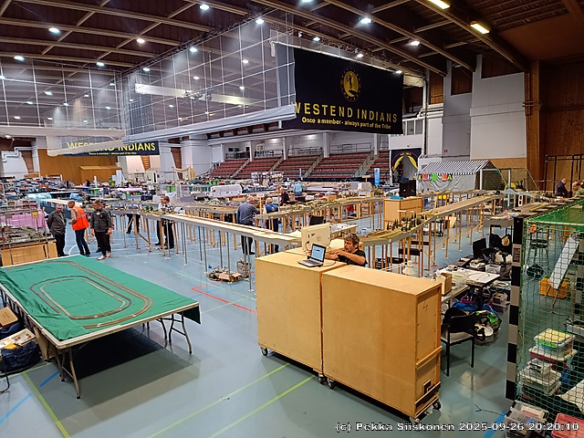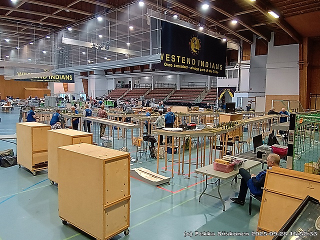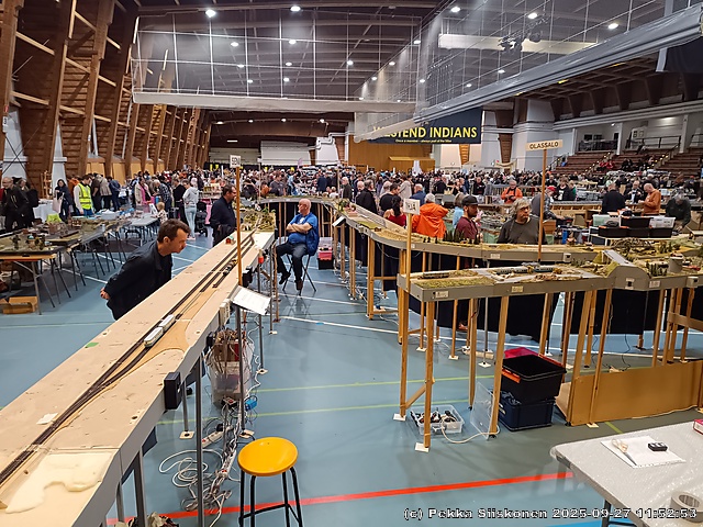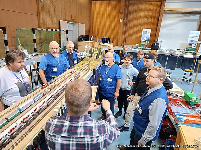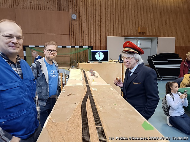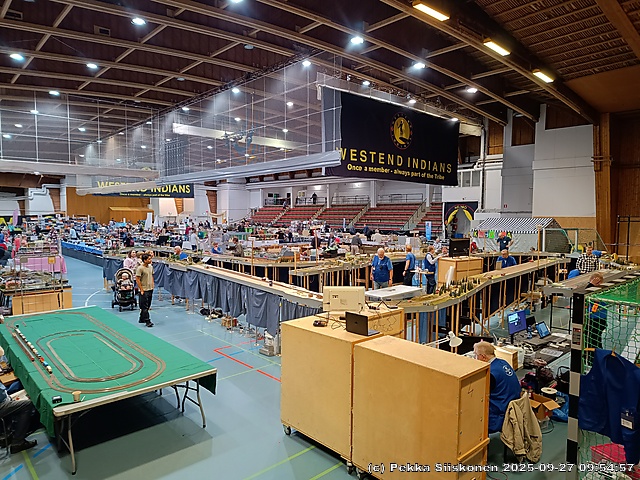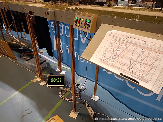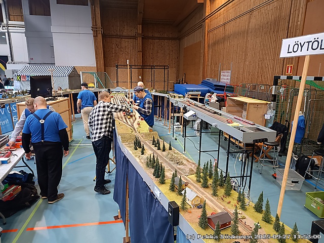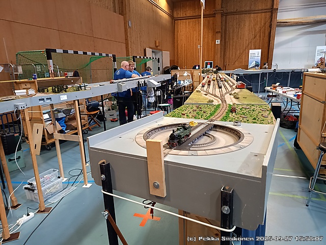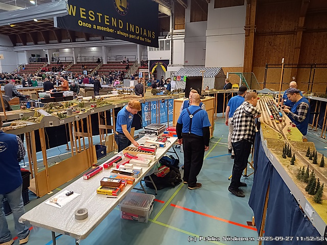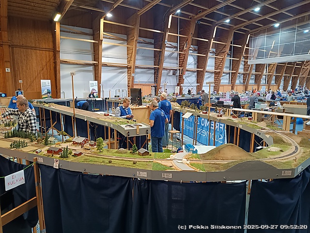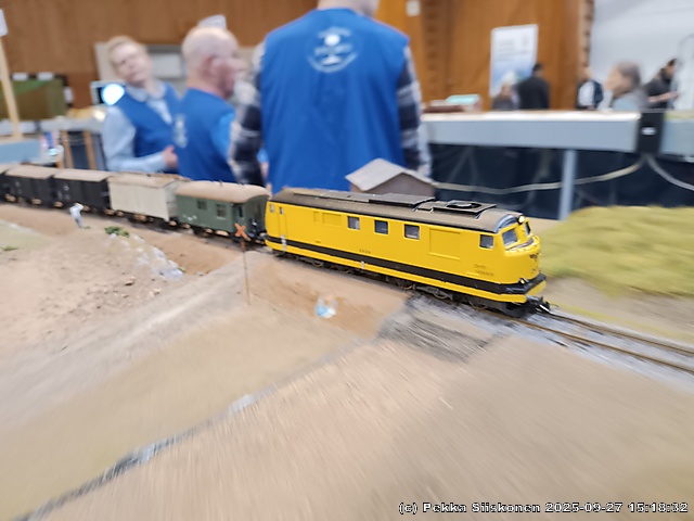 IMG_20250928_165232662_HDR.jpg Kello on 16:52. Näyttely sulkeutui klo 16. Kun kaikki liikkuva kalusto oli pois radalta, olivat kaikki työn touhussa, jotta Oulun moduulit saatiin pikaisesti irti radasta ja pakattua valmiiksi pitkälle kotimatkalle.