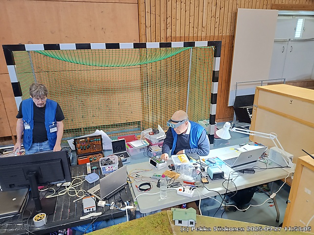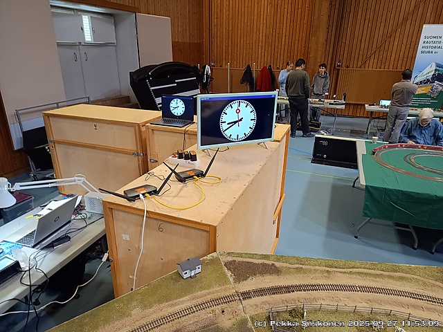 IMG_20250927_115304303_HDR.jpg Tekninen tila. Vasemmalla P. Koskela hoiti keskuskellon hallintaa ja WiFRED-ajolaitteiden ohjelmointia, oikealla A. Louko hoiti langallisten FRED-ajolaitteiden ja veturien ohjelmointia.