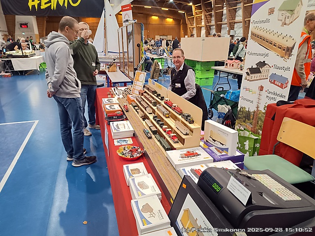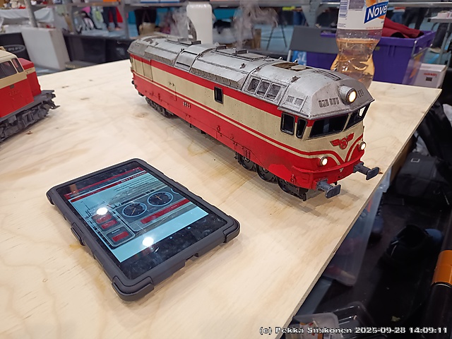 IMG_20250928_140911387.jpg J. Likosin ja T. Rosendahlin yhteisprojekti, 1-mittakaavan radio-ohjattava Hr13-veturi K. Wikströmin ja T. Rosendahlin osastolla. Huomaa joka pakoputkesta tuleva höyry, joka on piezo-elementin höyrystämää vettä, ei tavanomaisten veturimallien joka paikan likaavaa savutusöljyä.